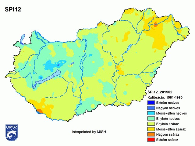 A 2018. évi nyári (SPI9) és a tavaszi időszakot (SPI12) is figyelembe véve a Dunántúl északi részét kivéve még az egész országban érzékelhetőek a tavalyi aszály nyomai. Az időtáv növekedésével az SPI9 térképén a Dráva mente, a Közép-Tisza vidéke és a Bodrogköz rajzolódik ki nagyon száraz területként (14. ábra). Ugyanezek a területek még 1 éves időtávlatban érkező csapadékmennyiség ellenére is (SPI12) aszályosak maradtak (15. ábra), azaz 2018. március és 2019. február között láthatóan kevesebb csapadék érkezett, mint az 1961-1990-es időszakban. Az SPI12 alapján ugyanakkor a Dunántúli-középhegységben lokálisan csapadéktöbblettel jellemezhető térségek is előfordultak (15. ábra).