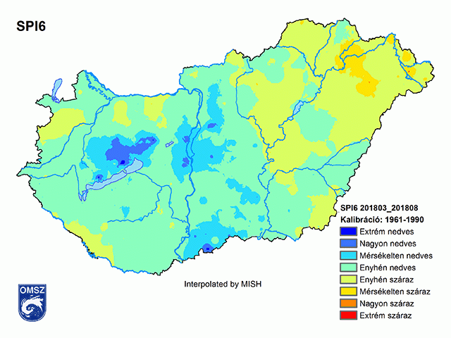 Az augusztusi SPI6 a március és augusztus között, tehát közel a teljes vegetációs periódusban lehullott csapadékmennyiséget viszonyítja az 1961-1990-es átlagokhoz. A 14. ábrán látható, hogy míg Északkelet-Magyarországon a Bodrogközben, a Felső-Tisza vidéken mérsékelten száraz területeket alakultak ki, ahol célszerű volt öntözni, addig Veszprém, Fejér és Bács-Kiskun megyében a szokásosnál több csapadékbevételt hasznosíthattak a növények.