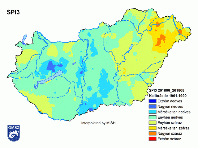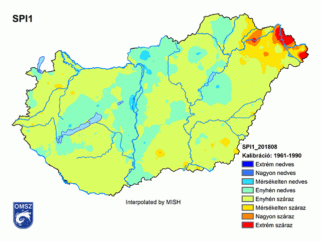 Az augusztusi háromhavi SPI területi eloszlása (13. ábra) jellemzi a nyári hónapokban érkező csapadék eloszlását. A nyár végére láthatóvá válik a Tiszántúlon, a Bodrogközben és a Nyírségben kialakuló meteorológiai aszály. Enyhén száraz területeket találunk a Dráva mentén és a Kisalföldön is. Ugyanakkor a Bakonyban, a Mezőföldön és a Bácskai löszháton hullott csapadék helyenként már többletet jelent (13. ábra).