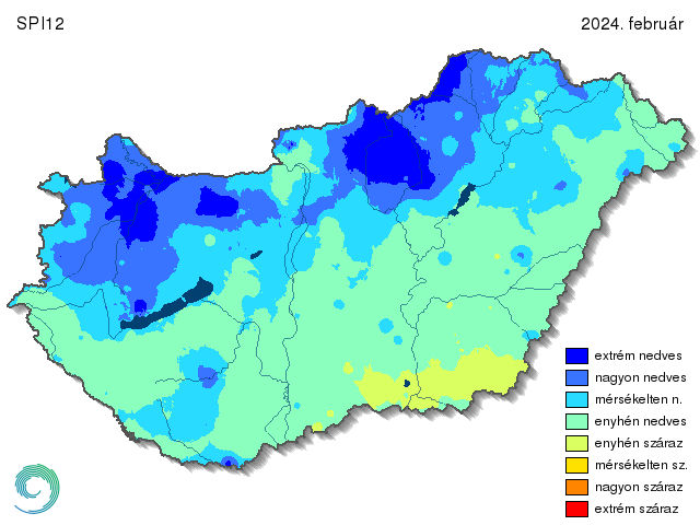 Az 1 éves időtávlatban érkező csapadékmennyiség (SPI12) hatása a 16. ábrán látható. Az előző két év februári SPI12 térképeivel ellentétben amikor alig jelentek meg nedves kategóriák most az enyhén száraz kategória a legszárazabb. Nagyban hasonlít ez az ábra a hathavi SPI-t ábrázolóhoz. Itt kissé kiterjedtebb az enyhén száraz terület a déli országrészben, valamint a Mártában és a Kisalföldön is több táj számít extrém nedvesnek.