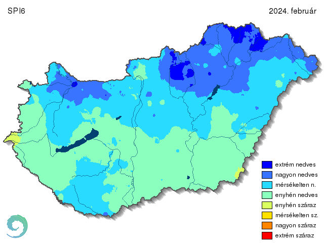 Az ennél is hosszabb időszakot figyelembe vevő standardizált csapadékindex az SPI6, aminek az eloszlását a 15. ábrán mutatjuk be. Ez az elmúlt fél év, azaz az ősz és a tél együttes összegzett csapadékmennyiségét veszi figyelembe. Ekkor már csak foltokban jelenik meg az enyhén száraz kategória (pl.: Szentgotthárd és Lőkösháza környéke). Az ország déli fele – a Mecsek kivételével – enyhén nedvesnek számít. Hazánk északi része már mérsékelten nedves kategóriájú, ezen belül pedig a Kisalföld és az Északi-középhegység már nagyon nedves. Extrém nedves területek is megjelennek foltokban, a Mátrában, a Tokaj-Zempléni-hegyvidéken, valamint a Feslő-Tisza-vidéken.