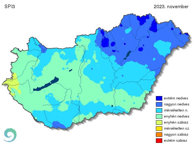 A 2023-as ősz az átlagosnál csapadékosabb volt, azonban szeptemberben a megszokottnál jóval kevesebb eső esett, míg novemberben csapadékos időjárás volt jellemző. Novemberben az egész ország valamelyik nedves kategóriába tartozott az SPI1 alapján (12. ábra). A Dunántúl legnagyobb része enyhén száraznak számított, innen kelet felé haladva egyre nedvesebb térségek voltak. A Dunától keletre fekvő tájakat már szinte csak nagyon nedves kategória uralta. Az ország északkeleti, keleti része pedig extrém nedvesnek adódott.