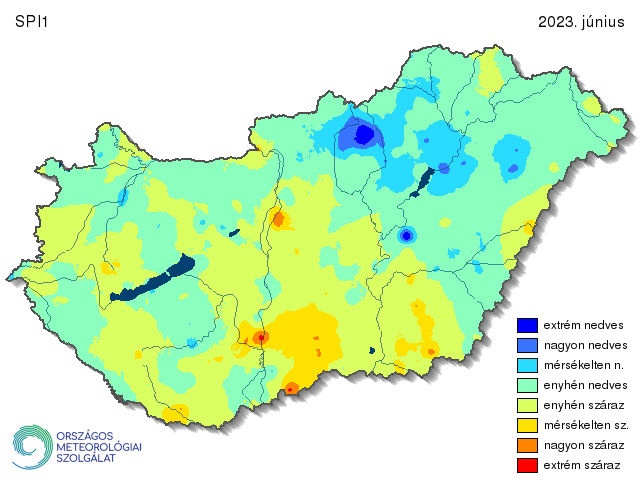 A standardizált csapadékindex (SPI) egyhavi értékei 2023 júniusában érték el a legnagyobb területen a mérsékelten száraz vagy annál súlyosabb aszály kategóriáját, noha a három hónap közül nem ez, hanem a július volt a legszárazabb. Magyarország mintegy felén enyhén nedves, másik felén enyhén száraz viszonyok voltak jellemzőek. A legnagyobb mérsékelten száraz terület a Duna-Tisza közén jelentkezett, mely átnyúlt kis mértékben a Dunántúlra is. A Körös-Maros közén és a Csepel-sziget térségében is adódott mérsékelten vagy annál szárazabb terület. Nedves vidékek főként az Északi-középhegységben és az Alföld északi részén jelentek meg, nagyobb területen alakult ki mérsékelten nedves kategória, de szigetszerűen jelentkezett nagyon és extrém nedves kategória is Ez utóbbi a Mártában és Szolnok környékén (13. ábra).