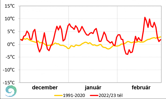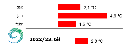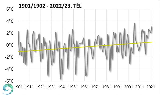2020 óta minden tél enyhe volt (az évszakos átlaghőmérséklet 2°C felett), de a 2022-23-as tél az elmúlt hármat is felülmúlta. Az 1901 óta íródó hosszú éghajlati sorban ez lett a második legmelegebb tél. Ez várható is volt, hiszen mindhárom hónap jócskán melegebb volt a sokéves átlagnál. Az évszak során lehullott csapadékmennyiség is meghaladta a szokásosat -­ nagyjából másfélszerese érkezett az 1991-2020-as értéknek országosan -, de térben és időben nagyon változó eloszlással.