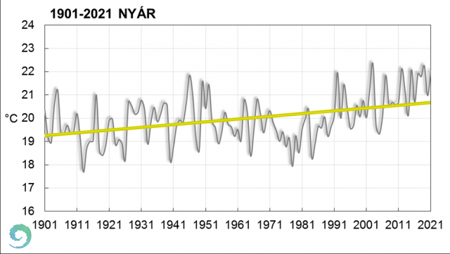 A nyári középhőmérséklet idősora 1901 óta a lineáris trendbecslés alapján melegedő tendenciát mutat (4. ábra). Az évszakos középhőmérséklet országos átlagának változása 1901 – 2021 között +1,4 °C. Az elmúlt 10 évben ez már a negyedik alkalom (2012, 2015 és 2019 után), amikor a nyári középhőmérséklet átlépte a 22 °C-ot.