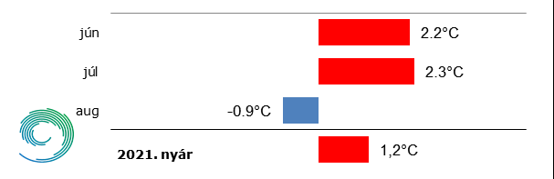 Az idei nyár országos átlagban 1,2 °C-kal bizonyult melegebbnek a megszokottnál (3. ábra). Az egyes hónapokat tekintve az 1991-2020-as átlagtól leginkább a júliusi átlaghőmérséklet tért el (+2,3 °C), melyet szorosan követ a júniusi (+2,2 °C). Az augusztus viszont hűvösebb volt az átlagnál (-0,9°C).