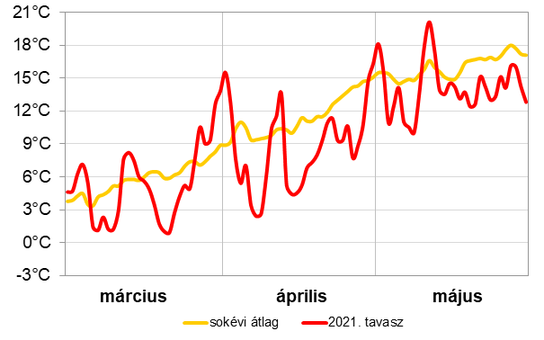 Az 5. ábránkon a 2021-es tavasz napi középhőmérsékleteit és a sokéves átlag értékeit mutatjuk be.Látható, hogy a teljes időszakban sokszor előfordult, hogy a sok évesátlag alatt alakult a napi középhőmérséklet. Márciusban két hosszabb hidegebb és három rövidebb melegebb időszak jelenik meg. Áprilisban a hónap nagyrészében jelentősen, 5-6 °C-kal alacsonyabb középhőmérsékletek jelentkeztek, alig alakult átlag felett a középhőmérséklet. Májusban is alig regisztráltunk átlag feletti országos középhőmérsékleteket, de ekkor már csak 3-4 °C-kal maradtak el a napi középhőmérsékletek az ilyenkor megszokottól.