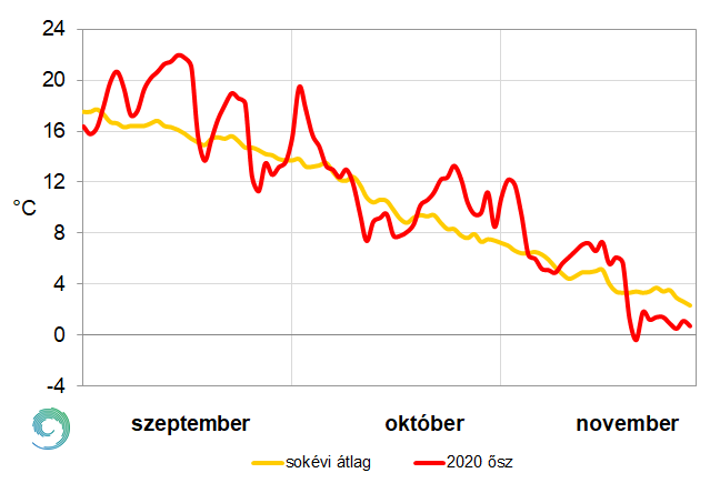 Az 5. ábrán a 2020-as ősz napi középhőmérsékleteit és a sokéves átlag értékeit mutatjuk be.Jól látszik az ábrából, hogy az átlagosnál lényegesen melegebb és hidegebb időszakok egyaránt előfordultak. Szeptember közepén, október és november elején hosszabb ideig a normál felett alakult a hőmérséklet, egy-egy napon a pozitív eltérés az éghajlati normáltól még az 5 °C-ot is elérte. A hűvösebb periódusokban jellemzően 2 °C-kal maradt el a hőmérséklet az 1981-2010-es normáltól. Ennél nagyobb negatív napi anomália csak november végén fordult elő, amikor egy ciklon hátoldalán sarkvidéki eredetű légtömeg árasztotta el térségünket.