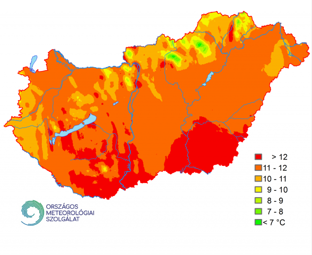 Magyarország legnagyobb részén az ősz középhőmérséklete 10–12 °C között alakult (1. ábra). A középhegységeink területén főként 10 °C alatti évszakos átlag fordult elő. A leghűvösebb Kékestetőn (7,6 °C), 400 m alatt Zabaron (9,0 °C) lett az ősz. A Dél-Dunántúlon és a Dél-Alföldön nagyobb területen 12 °C feletti középhőmérséklet is előfordult. Az ősz átlagos hőmérséklete néhány városi, belterületi állomáson a 13 °C-ot is meghaladta (pl. Szeged belterület: 13,2 °C).