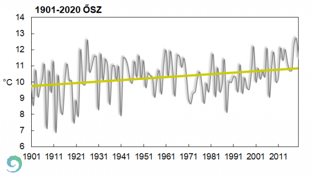 Az országos őszi középhőmérsékletek 1901 és 2020 között (interpolált adatok alapján)