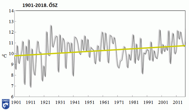 Az őszi középhőmérsékletek 1901-ig visszanyúló idősorát tekintve az illesztett trendvonal egy melegedés irányába mutató tendenciát mutat (4. ábra), melynek mértéke 0,95°C.