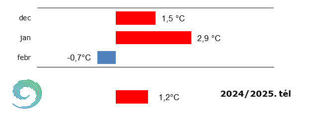 2024/2025 telén az egész országban az 1991–2020-as átlag felett alakult a középhőmérséklet (2. ábra). Az anomália legkisebb mértéke +0,5 és +1,0 °C közt volt, ez jellemezte a Mezőföldet és a Duna-Tisza közét. Hazánk legnagyobb részén +1,0 és +1,5 °C közötti eltérés uralkodott. Ennél nagyobb, +1,5 és 2,0 °C közti anomália a Mátrában és az Alföld középső és északkeleti tájain adódott, lokálisan még +2,0 °C feletti különbséget is tapasztaltunk.