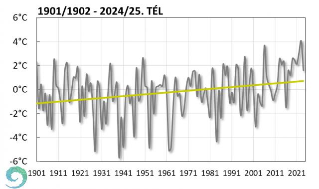 A téli középhőmérséklet idősora 1901 óta melegedő tendenciát mutat a lineáris trendbecslés alapján (4. ábra). Az évszakos középhőmérséklet országos átlagának változása 1901 – 2025 között +1,86 °C. Az elmúlt 13 télen – a 2016/2017-es telet kivéve – mindig a sokévesnél magasabbnak adódott a háromhavi átlaghőmérséklet.
