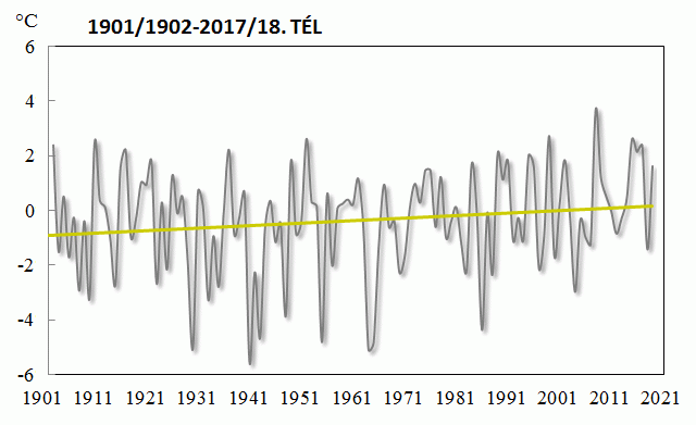 A téli középhőmérsékletek 1901-ig visszanyúló idősorát tekintve az illesztett trendvonal továbbra is a melegedés irányába mutató tendenciát mutat (4. ábra).