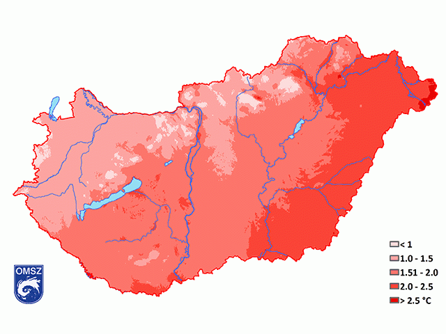 A 2. ábrán jól látható, hogy az 1981-2010-es átlagnál magasabb évszakos érték az egész országra jellemző volt. A Tiszántúl keleti része volt az 1981-2010-es normálhoz viszonyítva a legenyhébb (>2 °C). Az ország északnyugati tájai 1-1,5 °C-kal voltak melegebbek, míg a hegyvidékekben a sokévi átlag közelében alakult a hőmérséklet.