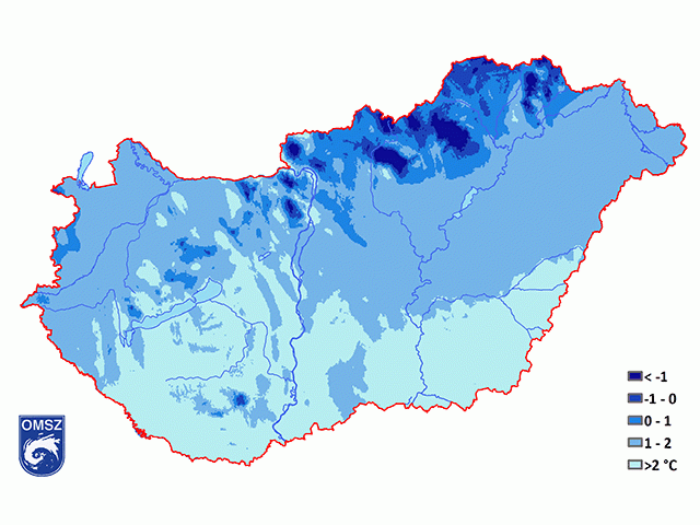 Az idei tél országos átlagban több, mint 1,7 °C-kal bizonyult melegebbnek a megszokottnál (3. ábra). Az egyes hónapokat tekintve az 1981-2010-es átlagtól leginkább a januári átlaghőmérséklet tért el (+3,8 °C), melyet a decemberi (+2,2 °C) követ, míg a február -0,8 °C-kal hidegebbnek adódott.