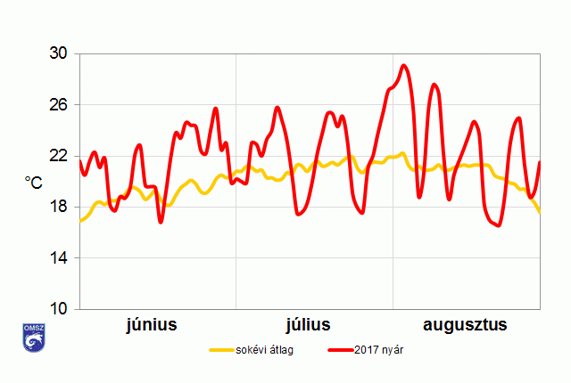 Július elején az országos napi középhőmérséklet a sokéves átlag alatt maradt, mert az idei első, június végi hőhullám után egy hidegfront hozott felfrissülést. Ezt követően a tartós anticiklonális helyzet miatt fokozódott a melegedés, melynek köszönhetően az 1981-2010-es normál felett alakultak a hőmérsékleti értékek. A júliusi csúcsérték is ebben a periódusban lépett fel, 10-én országosan 5,7°C-kal volt melegebb a szokásosnál. Majd a pár nappal később átvonult hidegfront után erős északnyugati áramlással száraz, hűvös levegő érkezett, így jelentősen visszaesett a hőmérséklet. Július 17-én Zabaron a napi minimumhőmérséklet mindössze 5,5 °C volt, a korábbi rekordértéket (5,6°C) 1996-ban Szécsényben mérték ezen a napon. A hónap második felében egyre inkább anticiklonális hatások érvényesültek, és rövidesen ismét kánikula alakult ki. A tartósan magas napi átlaghőmérséklet miatt 2017. július 20-23. között másodfokú hőségriadót rendeltek el. Az év második hőhullámának egy Nyugat-Európa felett kialakult ciklon vetett véget, így július 25-27. között már három fokkal volt hűvösebb a sokévi átlagnál (5. ábra). A hónap végén délies áramlással szaharai eredetű levegő árasztotta el a Kárpát-medencét, mely extrém hőhullámot okozott, és augusztus első harmadának időjárására is hatással volt.