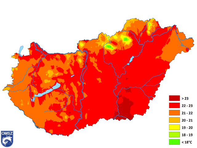 Hazánk legnagyobb területén 22-23 °C között alakult a nyári átlaghőmérséklet (1. ábra). A Dunántúlon, valamint az északi, északkeleti térségben a 20-21 °C közötti értékek is gyakorinak számítottak, míg a legmelegebb a főváros térsége, a Tisza alsó folyása és a Maros mente volt: itt a 23 °C-ot is meghaladta az évszakos átlag. A legmagasabb nyári érték 24.1 °C (Szeged belterület), a legenyhébb nyarat pedig Kékestetőn tapasztaltuk, itt az évszakos átlag 17.3 °C.