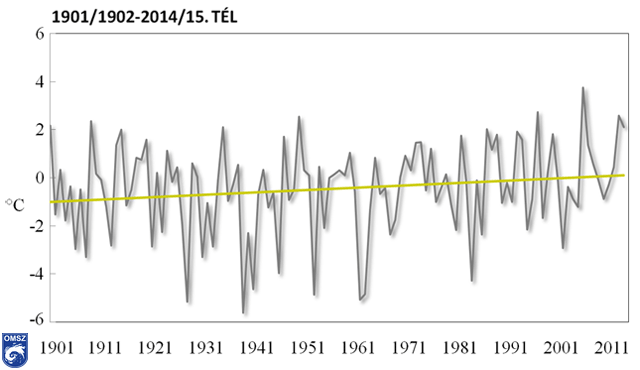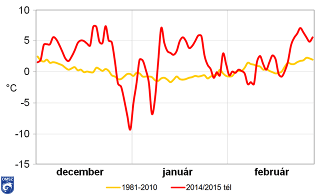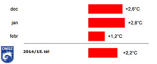2014/15 tele a megszokottnál melegebb volt. A csapadékviszonyokat tekintve a január jelentős többlettel telt, így az idei tél a három hónap átlagában csapadékosabbnak bizonyult a normálnál.