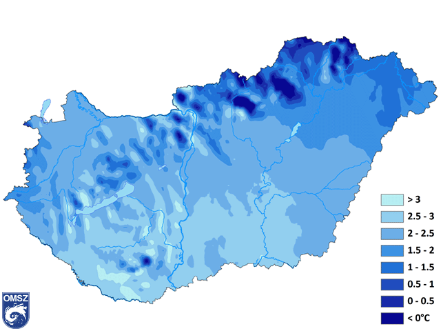 2. ábránkon jól látható, hogy az 1981-2010-es átlagnál alacsonyabb évszakos értékek sehol sem jelentkeztek, a teljes téli időszakot tekintve mindenhol melegebb volt a megszokottnál. A normált leginkább meghaladó értékek a keleti országrészben voltak jellemzőek, itt sokszor 2.5 °C-nál is nagyobb anomáliák léptek fel.