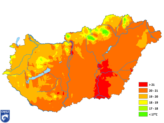 A legnagyobb területen 19-21 °C között alakult a havi átlaghőmérséklet. Egészen a Tisza vonaláig hűvösebb volt a szokásosnál az idei augusztus, leginkább nyugaton és északon maradtak el a hőmérsékleti értékek a normáltól (-0.5 és -1 °C közötti anomália). Keleten valamelyest melegebb volt a megszokottnál: jellemzően 0 és +0.5 °C közötti eltérés jelentkezett, a legnagyobb eltérés mértéke 0.5-1 °C közötti volt. A hónap elején meghaladták a napi középhőmérsékleti értékek a szokásos mennyiségeket, azonban 14-étől drasztikus változás lépett fel: augusztus második felében az átlagtól elmaradó értékek váltak uralkodóvá, és csak az utolsó egy-két napban emelkedett a középhőmérséklet a sokéves átlagnak megfelelő, vagy azt meghaladó szintre.