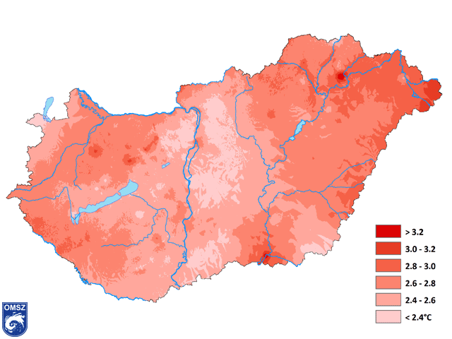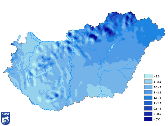 Az idei téli középhőmérséklet és az átlagos viszonyok közötti eltérés térképén szembetűnő a jelentős pozitív anomália. A tél országos átlagban 2.62°C-kal volt melegebb az átlagosnál, az ország középső részein az eltérés közel 2.5°C volt, másutt azonban még ennél is nagyobb, néhol a 3.0°C-ot is meghaladta.