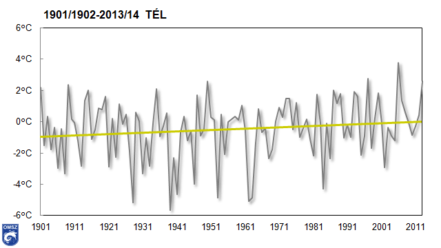 A téli középhőmérsékletek 1901-ig visszanyúló idősorát tekintve az illesztett trendvonal egy igen gyenge, melegedés irányába mutató tendenciát mutat (4. ábra). Az idei tél a 113 év 3. legmelegebb tele volt, csak az 1997/1998-as, illetve a 2006/2007-es tél előzi meg.