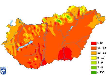 Idén ősszel az ország legnagyobb területén átlagosan 11-12°C közötti középhőmérsékletet jegyeztünk, de egy észak-déli irányú növekvő tendencia is megfigyelhető 1. ábránkon. A legalacsonyabb értékek észak-északnyugaton adódtak a három őszi hónap átlagában (zömmel 9-11°C), de közöttük is az Északi-középhegységben volt a leghűvösebb (7°C alatt). A legmelegebb Szeged környékén, valamint több helyen a Dunántúl Dunához közel eső részein és a Balaton térségében volt, ahol a 12°C-ot is meghaladta a középhőmérséklet.