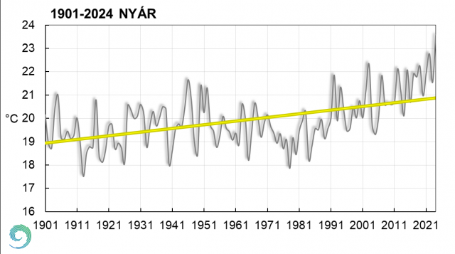 A 2024-es nyár középhőmérséklete 2,7 °C-kal haladta meg az 1991-2020-as éghajlati normált, és ezzel a legmelegebb nyár lett 1901 óta. Az évszak középhőmérséklete országos átlagban 23,5 °C-nak adódott. A jelentkező tartós hőhullámok következtében mindhárom hónap melegebb volt a megszokottnál, és előkelő helyen végzett a megfelelő hónapok rangsorában. A csapadék évszakos mennyisége országosan és helyi szinten is jelentősen elmaradt a sokéves átlagtól. A megszokottnál csapadékosabban indult a nyár, júniusban az országos összeg még meghaladta a sokéves átlagot, de két rendkívül száraz hónap követte, a 7. legszárazabb július és a 9. legszárazabb augusztus a XX. század kezdete óta.