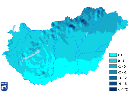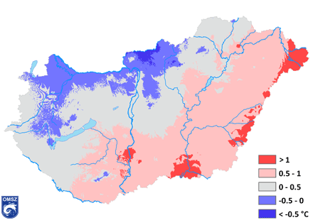 Az idei téli középhőmérséklet és az átlagos viszonyok közötti eltérés térképén ÉNy-DK irányú elrendeződés figyelhető meg: míg É-on (ÉNy-on) jórészt 0-0.5°C-kal hűvösebb volt a megszokottnál, a DK-i országrészben 0.5-1°C-kal melegebb volt a normálnál. Pátyod, Békéscsaba, Előszállás és Szeged környékén a szokásosnál több mint 1°C-kal melegebb havi középhőmérsékleteket regisztráltunk.