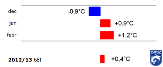 Az országos havi és az évszakos középhőmérséklet eltérése a sokévi (1971-2000-es) átlagtól 2012 telén (interpolált adatok alapján)