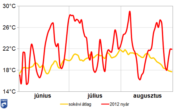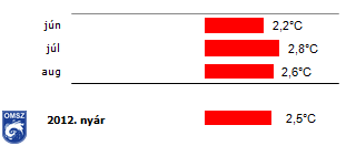 Az 1971-2000 közötti normál időszak értékeit a 2012-es nyári átlaghőmérsékletek mindenhol meghaladták hazánkban, az ország legnagyobb részén 2-3°C-kal melegebb volt a megszokottnál. Szeged térségében volt a legnagyobb az eltérés, a sokéves átlagnál 3.5°C-kal magasabb átlaghőmérsékleti értéket kaptunk eredményül a három hónap adatait tekintve.