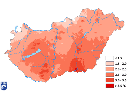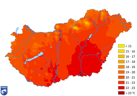 Az idei, rendkívül meleg, hőhullámokkal tarkított nyár a három havi országos átlagértékekben is megmutatkozik (1. ábra). A középhőmérséklet zömmel 20-22°C között alakult a nyár folyamán. Ettől hűvösebb a magasabban fekvő területeken volt jellemző, a Mátrában és a Bükkben 15°C alatti ez az érték. Melegebb az ország délebbi részein és Budapesten volt (22-23°C között), a legmelegebb pedig Szeged környékén, itt a 23°C-ot is meghaladó átlaghőmérsékletet regisztráltunk a három nyári hónap átlagában.