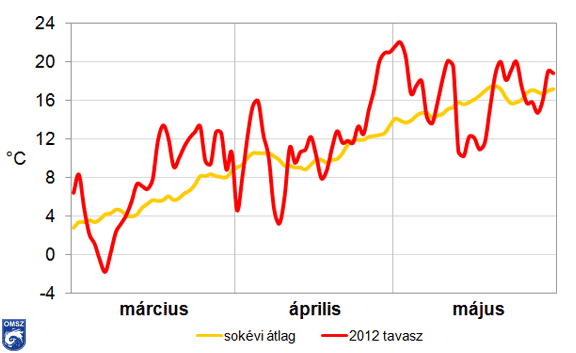 2012 tavaszán a szokásosnál magasabb hőmérsékletű hónapokat regisztráltunk, a legnagyobb eltérés márciusban volt, a legkisebb pedig májusban. Az idei március az elmúlt 112 év legszárazabb márciusa volt, az április szintén átlag alatt alakult csapadék szempontjából, míg májusban normál körüli csapadékösszeg jelentkezett országos átlagban, s így egy átlagosnál szárazabb tavaszt zártunk.