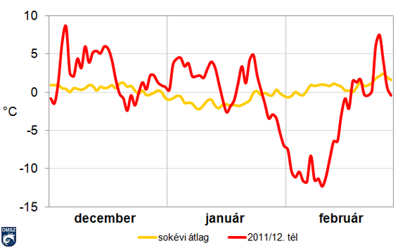 A következőkben összefoglaljuk, hogyan változott az országos átlagban vett napi középhőmérséklet a 2011/12-es tél során.