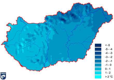 A január végén kezdődő lehűlés február elején a sokéves átlagnál 11-12 °C-kal alacsonyabb napi országos középhőmérsékleteket eredményezett. A legnagyobb különbség -13.3 °C volt, melyet a leghidegebb napon – amikor is a középhőmérséklet mintegy -12 °C volt -, 10-én figyeltük meg. Érdemi melegedés ezután kezdődött csak, egy hét múlva az értékek már az átlag közelében voltak. Ezt követően átmeneti ingadozás után az időjárás lassan kora tavaszira váltott.