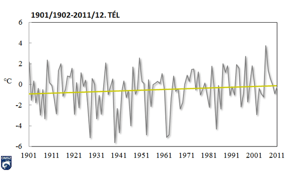 Az 1901/1902-es téllel kezdődő idősorban az idei tél átlaghoz közeli hőmérsékletének köszönhetően nem képvisel kiugró értéket (4. ábra). Az adatokhoz illesztett lineáris trend közel változatlan körülményekre utal, a jelentkező gyenge tendencia a melegedés irányába mutat.