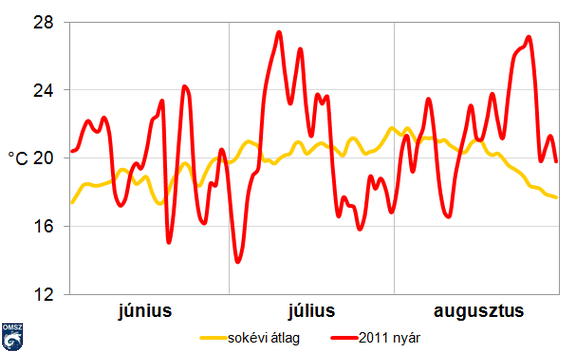 Míg a hónap elsõ felében országos átlagban a szokásosnál hidegebb volt, a második felében a szokásosnál melegebb napokat tapasztalhattunk. A leghûvösebb nap a 11-e volt, 17 °C alatti középhõmérséklettel. A legnagyobb kánikula augusztus 26-án volt, az átlaghõmérséklet ekkor a 27 °C-ot is meghaladta, a legmagasabb hõmérséklet országszerte 35 °C körüli volt.