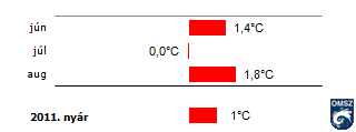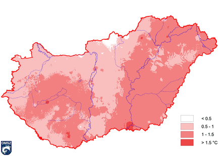 Az anomáliatérkép alapján látható, hogy az idei nyár egész hazánkban melegebb volt a szokásosnál (2. ábra). A legkisebb eltérés +0.5 °C-nál kisebb volt, Nógrád megyében volt jellemzõ, ám az ország nagyobb részén az eltérés +0.5 - +1.5 °C között alakult.