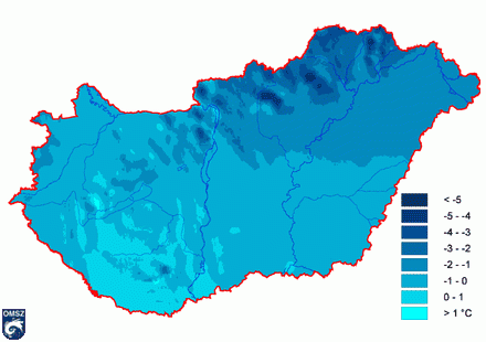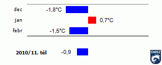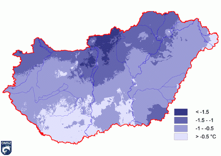 Országos átlagban a tél középhõmérséklete mintegy 0,9 °C-kal maradt el a sokéves átlagtól (3. ábra). Havi bontásban a negatív eltérések meghaladták ezt az értéket, decemberben a különbség -2 °C-ot is megközelítette. Az évszakban csupán a január volt enyhébb a szokásosnál, 0,7 °C-kal.