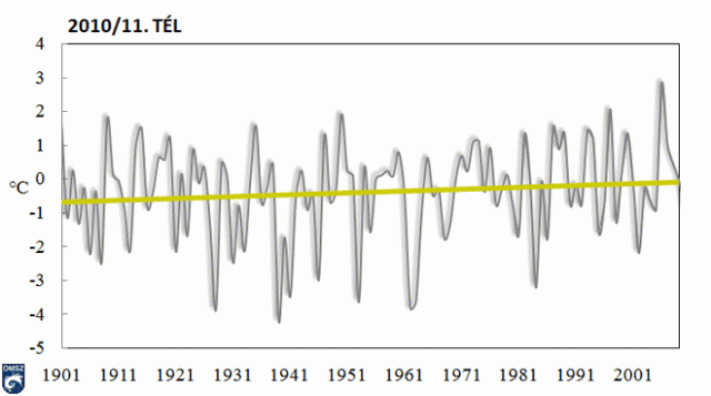 Bár az idei tél a 31. leghidegebb - 80. legmelegebb - tél volt az elmúlt 110 év során (I. táblázat), nem volt kiugróan hideg, az 1939-es és 1962-es középhõmérsékleteknek a közelében sem volt (4. ábra). A 110 év teleihez illesztett trendvonal enyhe hõmérséklet-emelkedést jelez.