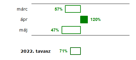 A 8. ábrán jól látható, hogy a tavasz első hónapja száraznak adódott, a regisztrált mennyiség márciusban csupán a normál 53%-a volt. Áprilisban a megszokottnál 20%-kal több csapadék hullott. A májusi csapadékmennyiség mindössze 47%-a volt normál értéknek, tehát a megszokott mennyiség fele sem hullott le. A teljes tavaszi időszak alatt így közel 30%-kal kevesebb csapadék volt, mint általában.