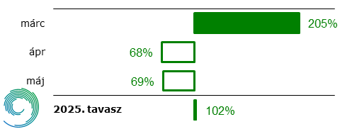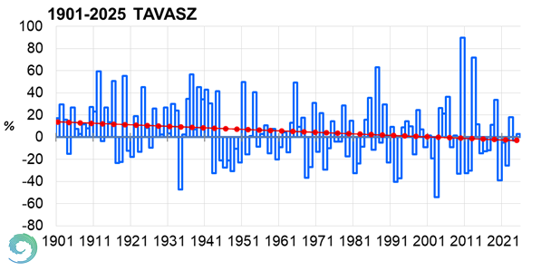 Ahogy a megelőző évszakok, úgy 2025 tavasza is melegebb volt az 1991-2020-as éghajlati normálnál. A hűvös május ellenére a középhőmérséklet országos átlagban 0,5 °C-kal haladta meg a sokéves átlagot. A csapadék mennyiége országosan a megszokott közelében alakult, de hazánk közel felén hiány jelentkezett a három hónap alatt. Márciusban az átlagnál kétszer több hullott, de áprilisban és májusban is kb. 30-30%-os hiány lépett fel.