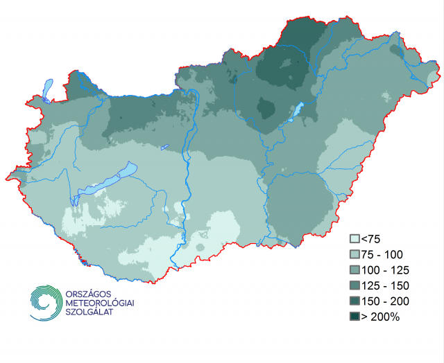2020 őszén hazánk legnagyobb részén az 1981-2010 normálhoz hasonló csapadékmennyiség hullott le, de a térbeli különbségek igen jelentősek voltak. (7. ábra) A Dunántúl déli tájai a normálnál jóval szárazabban (a sokévi érték < 75%-a), míg az északi- északkeleti tájak még az Alföldön is a szokásosnál csapadékosabban alakultak (125-150%). Az éghajlati normál 150–200%-a jellemezte a Kisalföldet és az Északi középhegységet. A legnagyobb csapadéktöbblet a Bükk és a Cserehát területén, a Sajó vízgyűjtőjén fordult elő. Ebben a régióban a sokévi átlag duplájánál is több csapadék hullott 2020 őszi hónapjaiban.