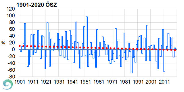 Országos átlagban 2020 őszén 149,9 mm csapadék hullott, ami az 1981–2010-es átlag 102%-a, tehát összességében egy átlagosan csapadékos évszak múlt el, az évszakon belüli eloszlás azonban különösen egyenetlen volt. Szeptemberben a szokásosnál 35%-kal, novemberben 68%-kal kevesebb csapadékot összegeztünk. A november különösen száraz volt, a sokévi érték alig harmada hullott le. Az október viszont nagyon csapadékosnak adódott, mivel az átlag több mint kétszerese, annak 232%-a volt országosan (8. ábra). Az őszi csapadék közel 80%-a szeptember 25. és október 15. közötti, alig három hét alatt hullott le főként az északkeleti országrészben.