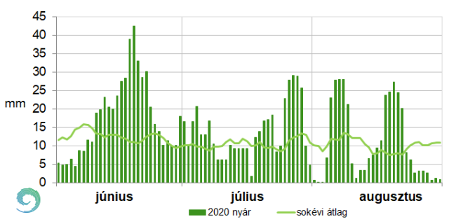 Nyáron átlagosan 35 csapadékos napot jegyeztünk (napi összeg ≥ 0,1 mm), míg a normál 28 nap. Számos településen volt felhőszakadás, amikor egyetlen nap alatt akár 50 mm-t vagy 100 mm-t meghaladó mennyiségű csapadék érkezett. Az évszak legnagyobb napi csapadékösszege 178 mm volt, amit július 24-én a Somogy megyei Vése állomáson mértünk. Országos átlagban átlagosan 17 nap volt zivataros, mely 6 nappal több, mint a normálérték. A legtöbb zivataros napot 2020 nyarán Pilisvörösvár állomáson rögzítettük (36 nap).
