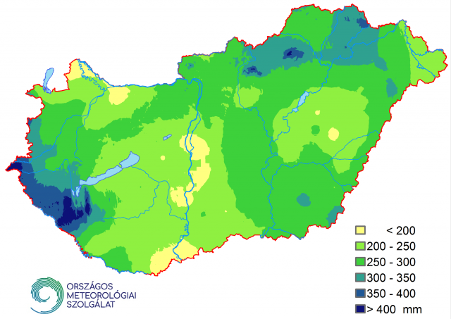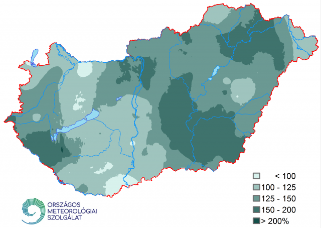 Az átlagosnál csapadékosabbak voltak a Dunántúl délnyugati tájai, Pest megye továbbá az Alföld jelentős része a Tisza mentén (150%-200%). Az átlagosnál kissé szárazabb területnek adódott a Kisalföld és a Duna menti síkság déli része és a Nagy-Sárrét (7. ábra) térsége. Máshol jellemzően a sokévi átlag közelében alakult a lehulló csapadék mennyisége.