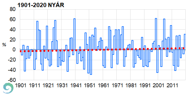 A nyári csapadékösszegek hosszú idősorát tekintve 2020 nyara csapadékosabb volt, mint a sokévi átlag, azonban a 9. ábrán látható, hogy az országos nyári csapadékösszegek exponenciális trendbecslése alapján a 120 év alatt nem azonosíthatunk jelentős változást.