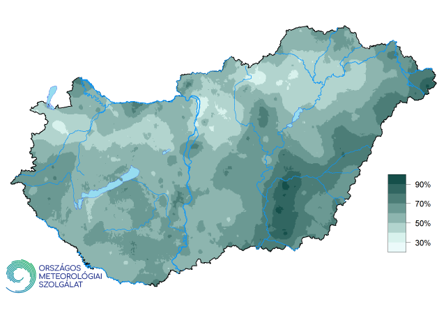 Hazánk szinte egész területén elmaradt a csapadékmennyiség az átlagtól, csak délkeleten egy-egy helyen érte el azt. Az Észak-Dunántúlon, a középső országrészben és az Északi-középhegységben 60% feletti csapadékhiány is előfordult (7. ábra). Mivel keleten többfelé 100 mm felett alakult a tavaszi csapadék, így a Tiszántúl jellemzően csak 10–30%-kal volt szárazabb a normálnál.