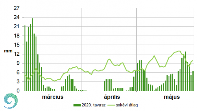 2020 tavasza extrém száraz volt. Az ország döntő részén a 100 mm-t sem érte el az évszak csapadékösszege (1. ábra). Az ország északi felén többfelé 75 mm alatt maradt a tavaszi csapadék mennyisége, de néhol az 50 mm-t sem érte el (pl. Pétervására: 35,0 mm, Aszód: 47,8 mm). Csapadékosabb területnek a hegyvidékek (pl. Nagy-Hideg-hegy: 149,6 mm), a délnyugati országrész és a Tiszántúl számítottak (pl. Gacsály: 146,3 mm).